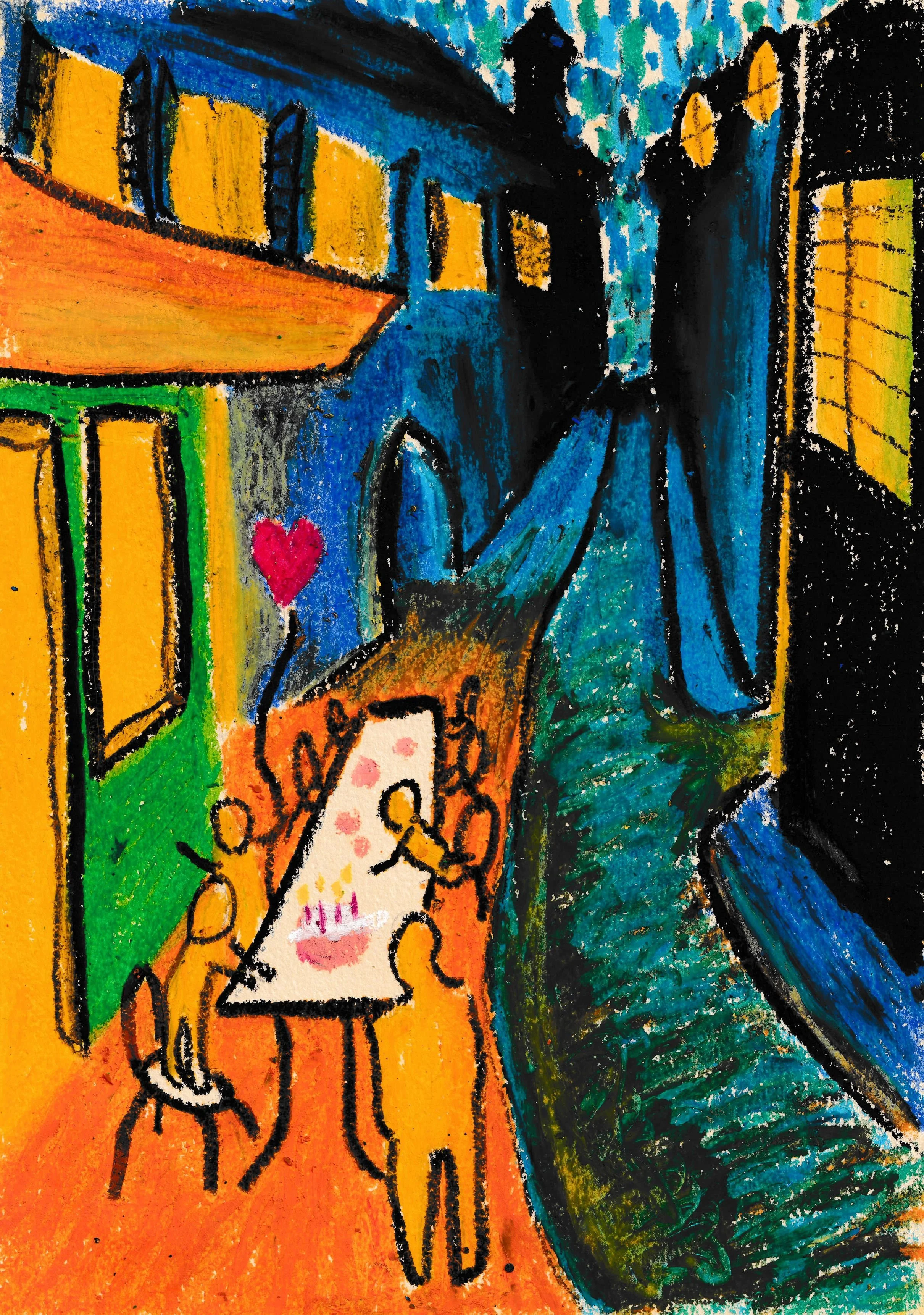 Plonger le regard dans cette scène, c’est s’offrir une parenthèse douce, où le réel semble suspendu dans une lumière tamisée. L’image invite à la déambulation intérieure, à se laisser envelopper par une atmosphère chaleureuse, presque feutrée, comme un murmure dans le soir. Chaque détail semble vibrer à sa manière, comme si le temps s’étirait dans cette bulle familière, et un peu magique. Il y a dans cette composition un parfum de retrouvailles, un écho de poésie simple, où l’intime et le collectif se rencontrent. Le spectateur, lui, devient le passant, l’hôte ou le rêveur, selon l’instant. Une môme ode, discrète et vibrante, à la Terrasse du café le soir de Van Gogh, rappelant que la beauté naît parfois dans ces instants simples, une soirée, une fête, éclairés par la promesse d’une nuit douce.