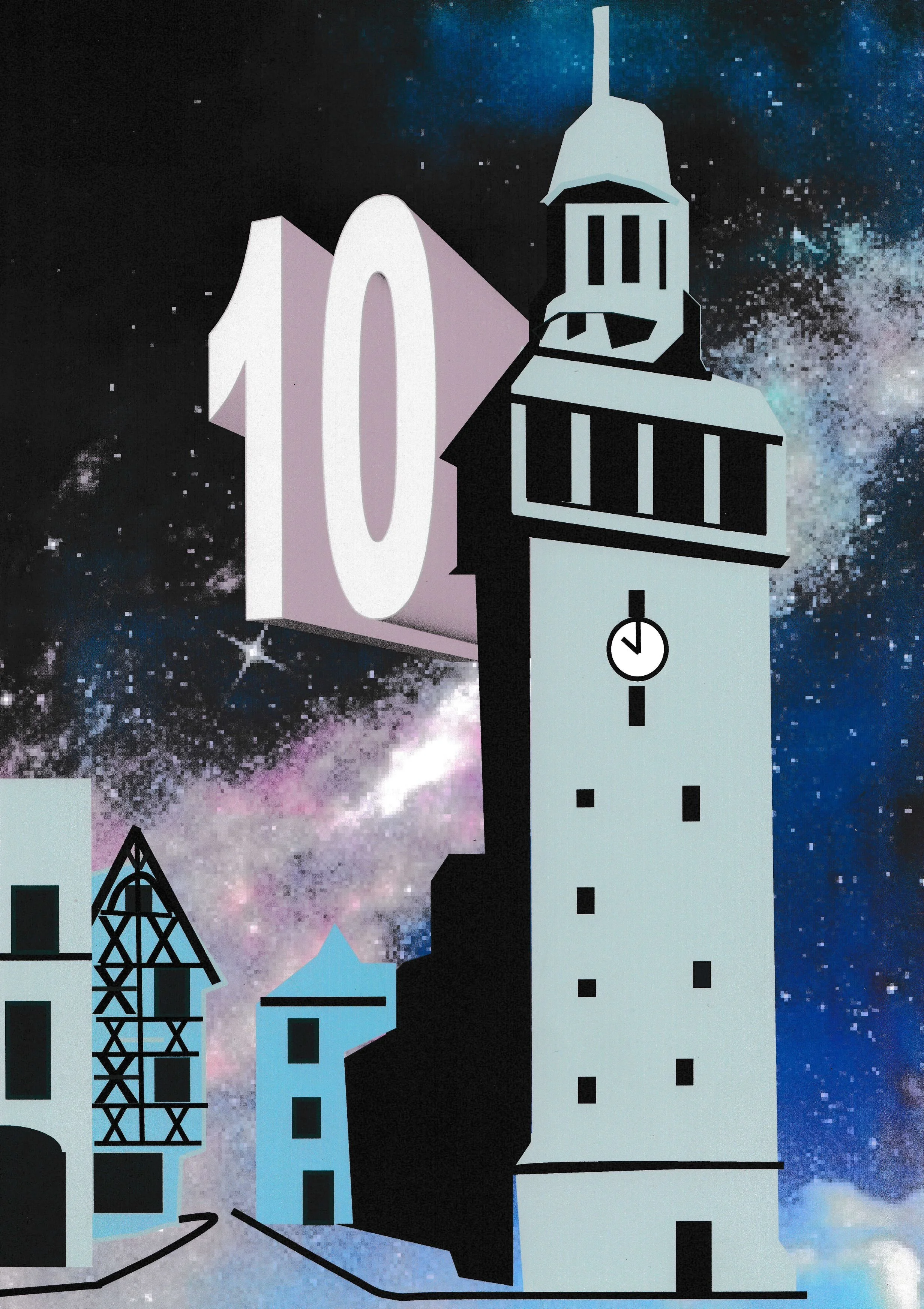 Pour cette affiche réalisée à l’occasion de la dixième édition de La Nuit des Artistes, j’ai choisi de mettre en avant un symbole fort du quartier historique de Moulins : le Jacquemart. Il incarne l’identité du lieu et permet d’ancrer visuellement l’événement dans son contexte local. Le chiffre 10, placé de manière visible, souligne l’importance de cette édition anniversaire. Enfin, le fond de nuit évoque naturellement l’ambiance de l’événement, qui se déroule en soirée, tout en apportant une touche de mystère et de poésie.